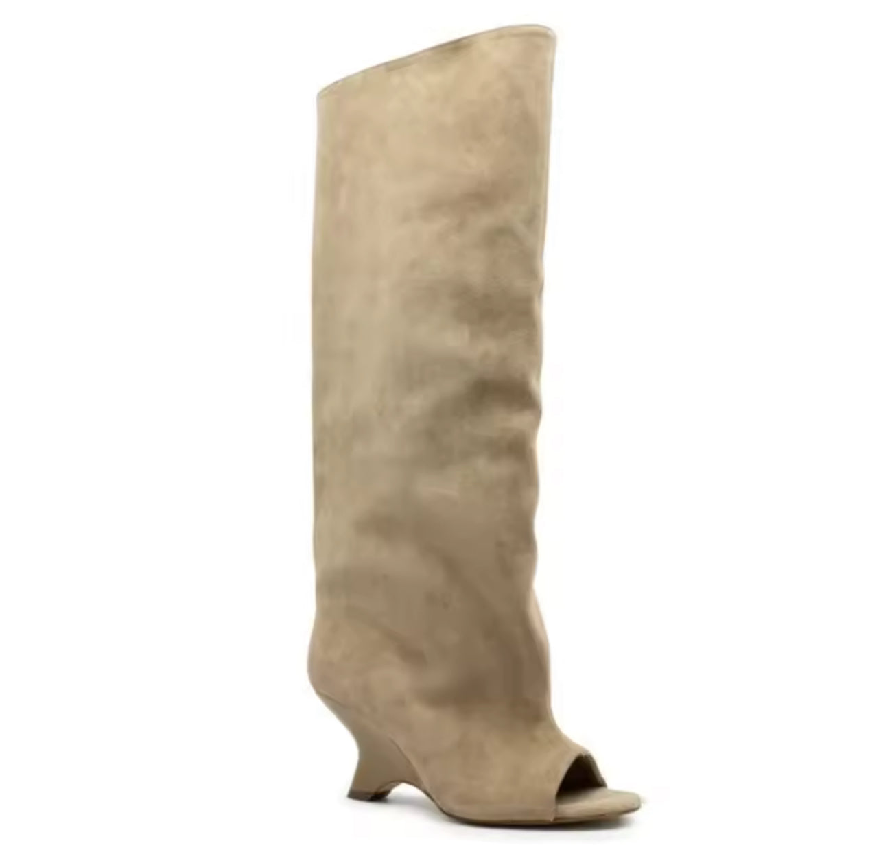 Diese auffälligen Damen Stiefel sind das ultimative Statement für Fashionistas. Mit ihrem Peep-Toe-Design, dicken High Heels und kniehohem Schnitt vereinen sie Sommer-Leichtigkeit und extravaganten Stil.